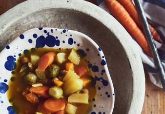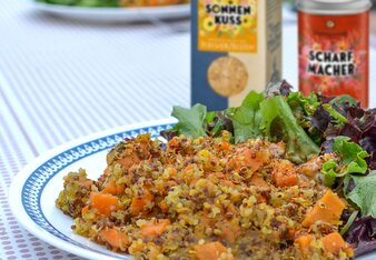Salz, Kartoffelstärke bio, Tomaten bio (8 %), Miso bio (SOJAbohnen bio, brauner Reis bio, Meersalz, Koji (Aspergillus oryzae)), Karotten bio (5 %), Paprika bio (4 %), Zwiebeln bio (4 %), Gewürze bio (Koriander bio, Macis bio, Ingwer bio, Kurkuma bio, Knoblauch bio, Pfeffer bio, Piment bio), Champignons bio (<1 %), Sonnenblumenöl bio, Steinpilze bio (<1 %), Kräuter bio (<1%) (Petersilie bio, Oregano bio).