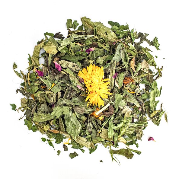 Hanfblätter*,  Zitronenverbene*,  Krauseminze*,  Ringelblumen*,  Spitzwegerich*,  Rosenblüten*,  Zitronenmelisse*