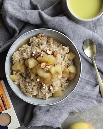 Auf dem Foto ist eine Schüssel mit Porridge zu sehen. Darauf ist Apfelkompott verteilt. Daneben liegt eine Packung Zimt gemahlen. | © SONNENTOR