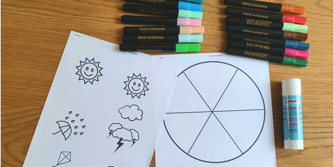 Als Erstes nimmst du die ausgedruckte Vorlage und malst alle Motive, wie die Sonne, die Wolken, den Pfeil usw. aus. Wenn alle Elemente bunt sind, schneide sie gemeinsam mit dem Kreis aus. Da das manchmal etwas schwierig sein kann, lass dir von einem Erwachsenen helfen. Als nächstes ist es an der Zeit, alle ausgeschnittenen Motive an den Kreis mit Kleber anzubringen. Hier ist wichtig, dass jeder Kreissektor, es gibt insgesamt 6 davon, ein Element beinhaltet. Um das Wetter anzeigen zu können musst du nun den Pfeil zu der Uhr hinzufügen. Nimm das kleine Stück Papier, es sollte nicht größer als 3 Zentimeter groß sein, und rolle es zusammen. Mache ein Loch in die Mitte des Kreises sowie am Ende des Pfeils mit einem Bleistift und stecke dann das fest zusammengerollte Papierstück hindurch, so wie auf dem Foto. Befestige es nun mit etwas Flüssigkleber. Falls du eine Rundkopfklammer zu Hause hast, kannst du auch diese für das Anbringen des Pfeiles verwenden. Fast geschafft, jetzt fehlt nur mehr die Schnur, damit du die Wetteruhr aufhängen kannst. Fixiere die beiden Enden der Schnur an der Rückseite und schon bist du fertig!