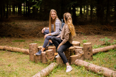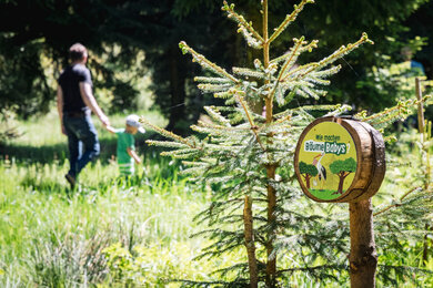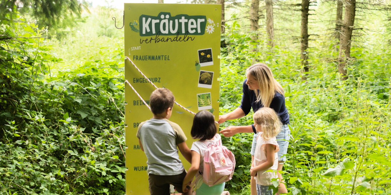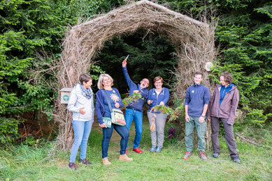 Um den Wald nachhaltig nutzen zu können, folgte als nächster Schritt eine sorgfältige Analyse des Ist-Zustandes: Es galt, die Besonderheiten des Waldes zu entdecken, die passenden Bereiche zu identifizieren und geeignete Materialien auszuwählen. Kaum vorstellbar, dass jede einzelne der 19 Erlebnis-Stationen von der Idee bis zur Umsetzung im Haus bei SONNENTOR entstanden ist. Wir haben viel recherchiert und getüftelt und unsere Betriebsmeister durften ihr handwerkliches Geschick unter Beweis stellen. Das Ergebnis kann sich sehen lassen: Einzigartige Stationen, die auf charmante und spielerische Art und Weise in das Ökosystem Wald eintauchen lassen. So können es sich unsere Gäste unter anderem bei einer kostenlosen Fußmassage auf dem weichen Waldteppich und Entspannung mit Waldyoga-Anleitungen im Wald-Reich richtig gut gehen lassen. Eine zauberhafte Märchen-Station lädt zum Ratespiel ein, ein Waldfoto mit Zapfenbart und Waldperücke erinnert noch lange an das gemeinsame Abenteuer. Und apropos Abenteuer: Auch die olympischen Spiele haben wir kurzerhand ins Grüne verlegt. Disziplinen wie „Zapfenzielwurf“, „Tierisch auf Zack“ und „Waldhüpfer“ fordern die ganze Familie heraus. Rätsel-Fans und Wissensdurstige erfahren im Wald-Reich, welche Wildkräuter und Früchte im Wald zu finden sind, wie Bäume sprechen, wer der trommelnde Zimmermann des Waldes ist oder warum Ordnung bei Totholz fehl am Platz ist.
